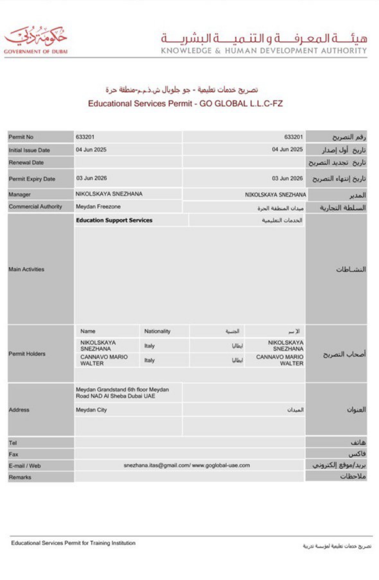 Educational Services Permit — GO GLOBAL L.L.C-FZ, Knowledge & Human Development Authority (KHDA), Dubai.